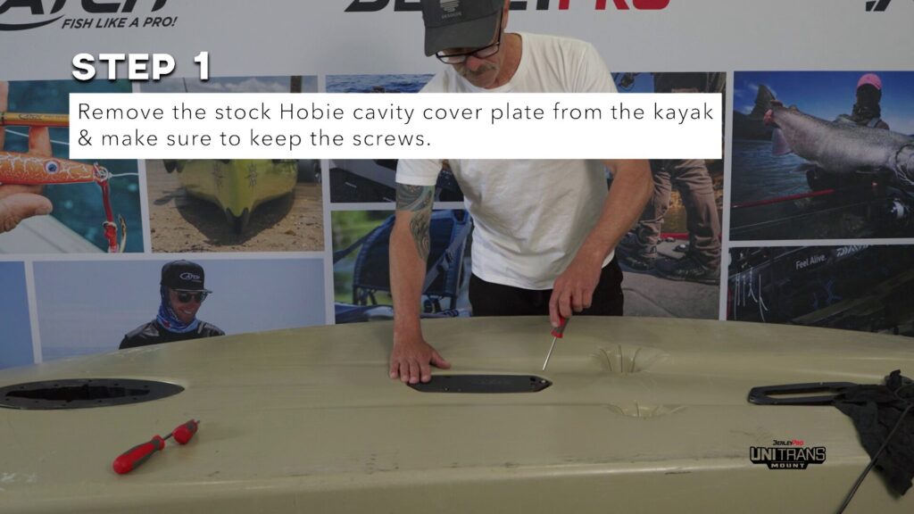 Remove the stock Hobie cavity cover plate from the kayak and make sure to keep the screws.