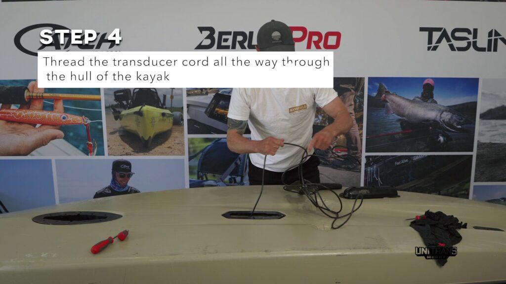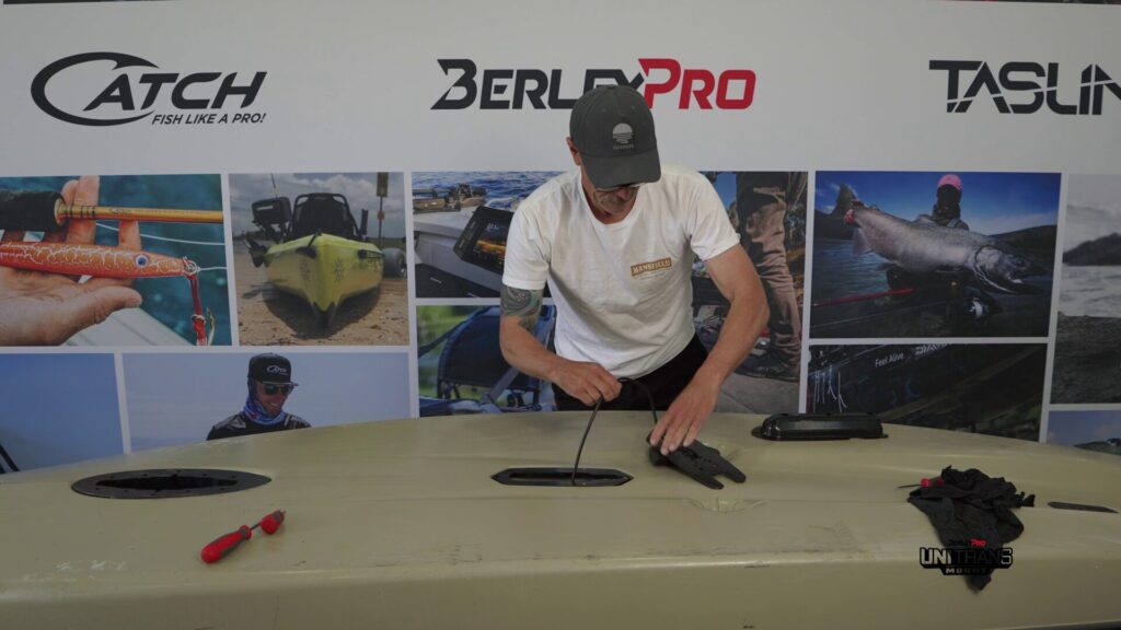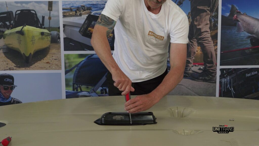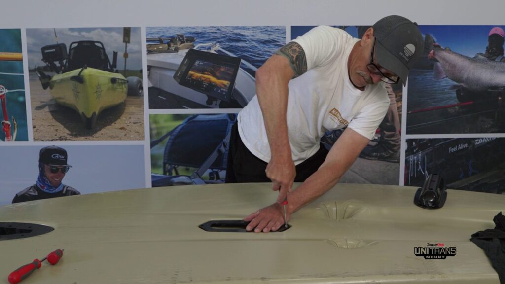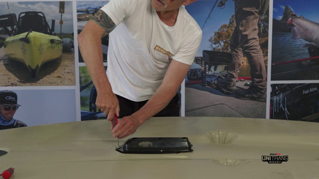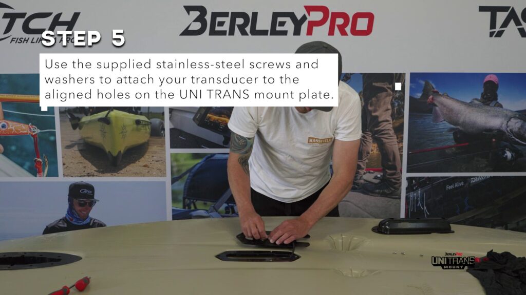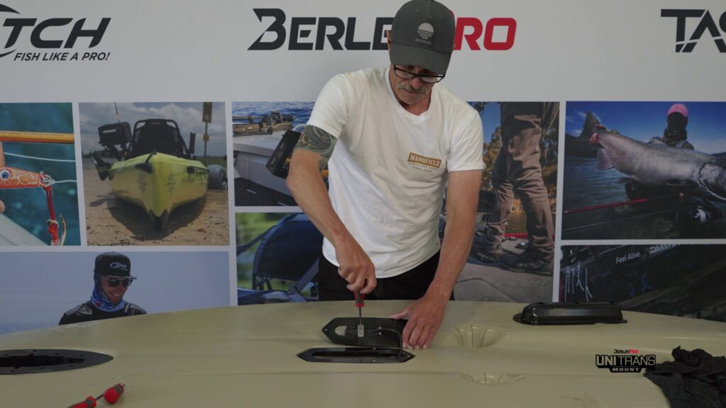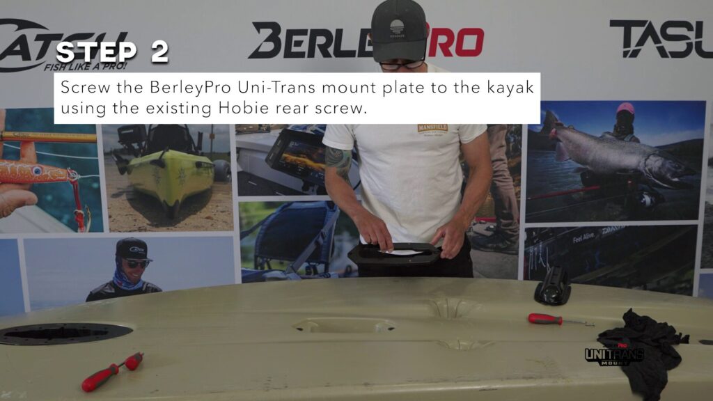 Screw the BerleyPro UNI TRANS mount plate to the kayak using the existing Hobie rear screw.