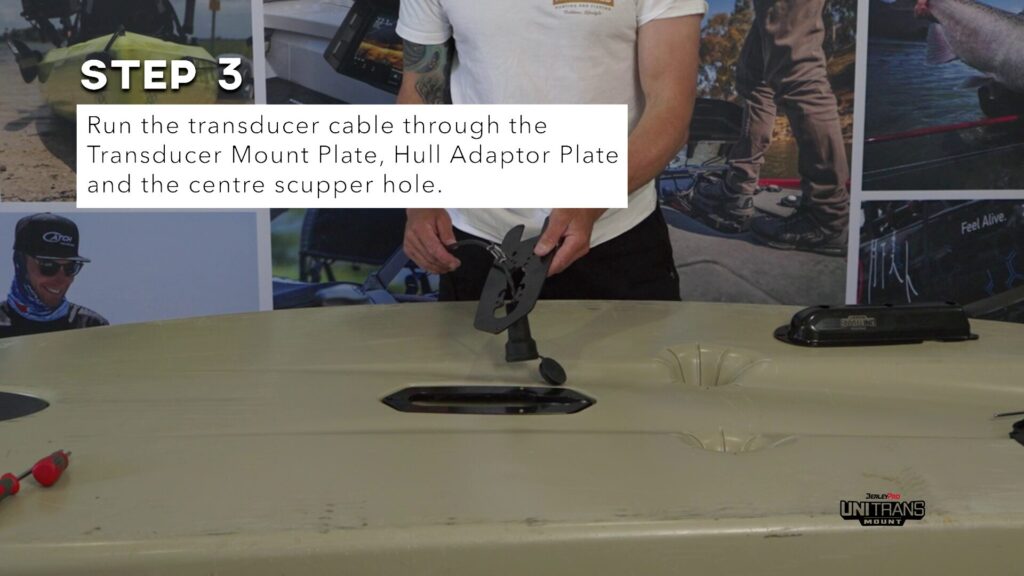 Run the transducer cable through the Transducer Mount Plate, Hull Adaptor Plate and the centre scupper hole.