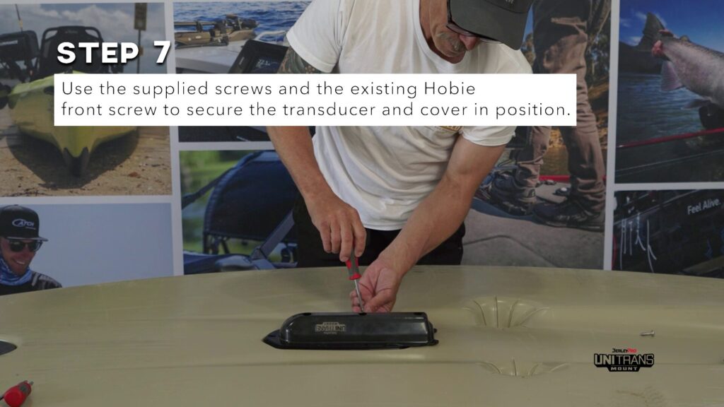 Use the supplied screws and existing Hobie front screw to secure the transducer and cover the in position