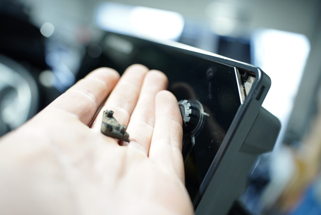 Step 2 – Remove the leads from the rear of the unit, and then remove all 4 screw cover tabs from each corner of the screen. Lightly pry them out with a small screwdriver – this exposes the flush-mount screws we will use to mount the visor